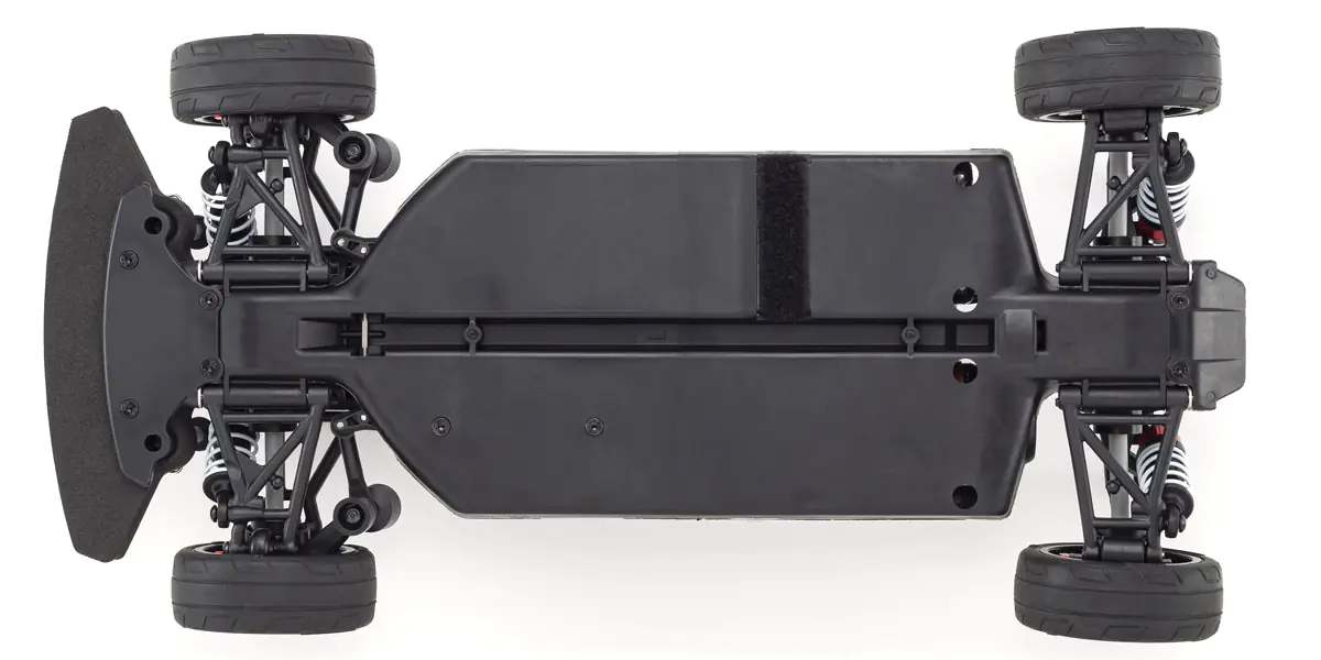 Simple low center of gravity upper deckless chassis design features an electronic speed controller and receiver cover as well as a one-piece gearbox that optimizes main chassis torsional rigidity and strength while reducing weight with the introduction of lightweight impact-resistant nylon.