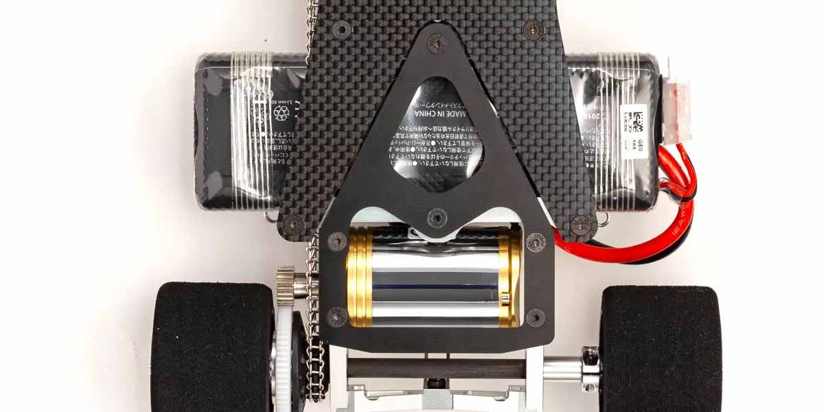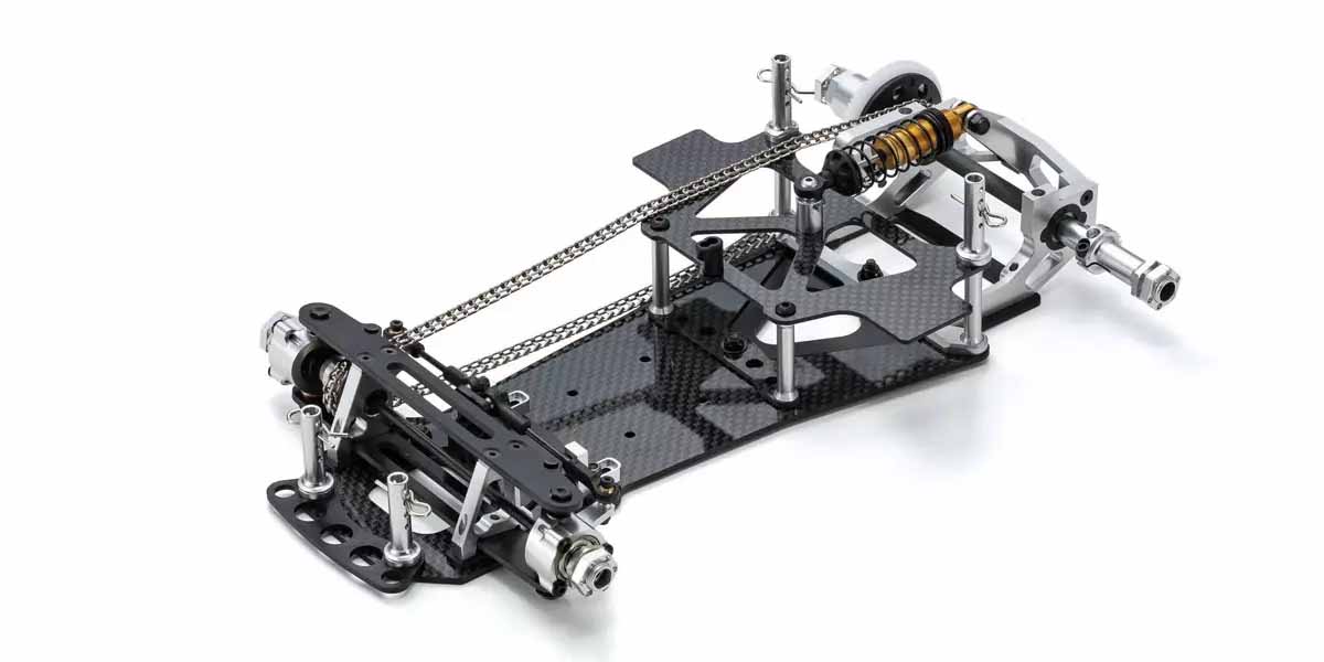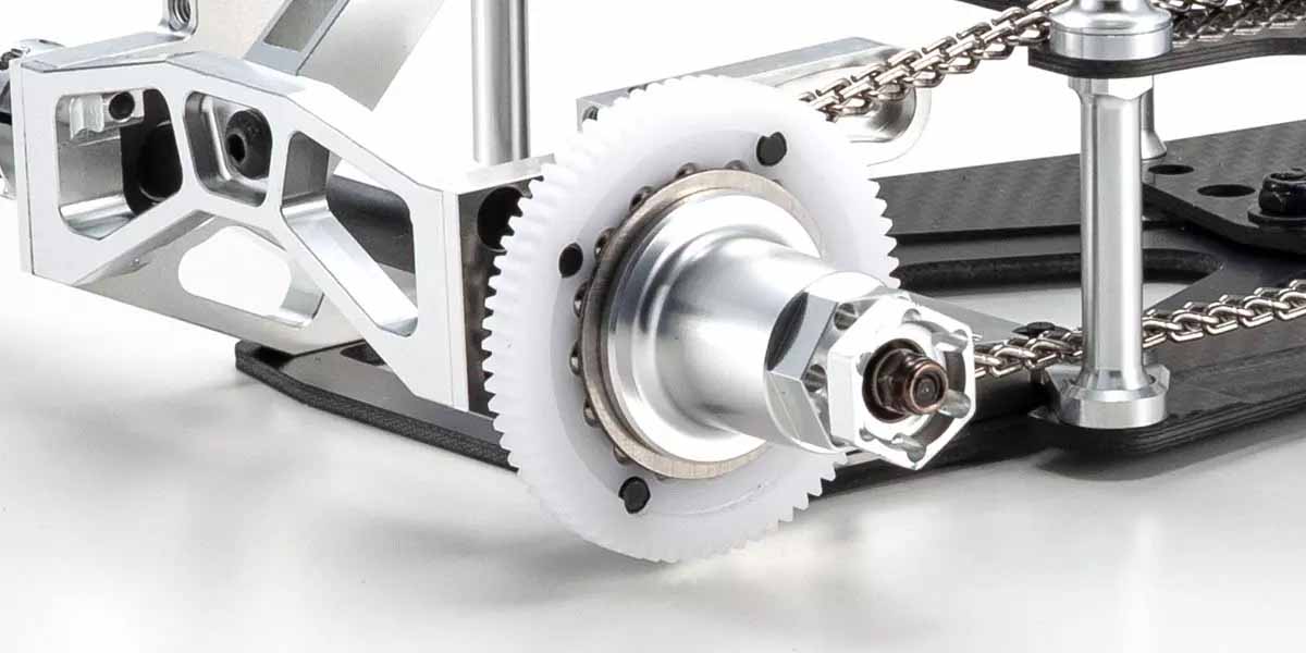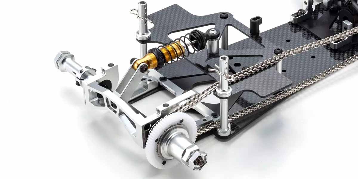 Carbon fiber main chassis, based on the reproduced Plazma MK.3 Limited, is optimized for chain drive. Precision milling minimizes chain interference, while a relocated servo mount balances moderate flex with high rigidity for improved cornering performance.